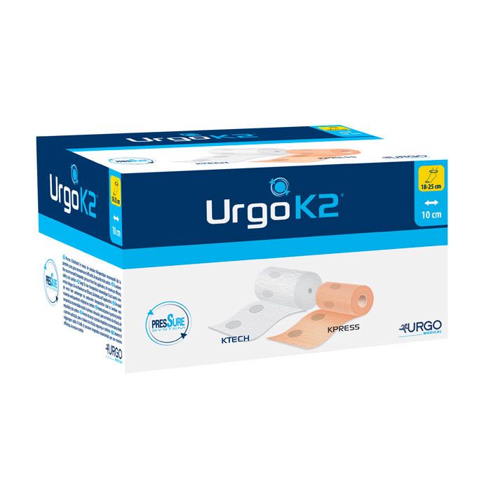 • L'efficacité d'Urgo K2 ou Urgo K2 Latex Free a été testée et validée pour l'application conjointe de KTech et KPress (ou KPress Latex Free).