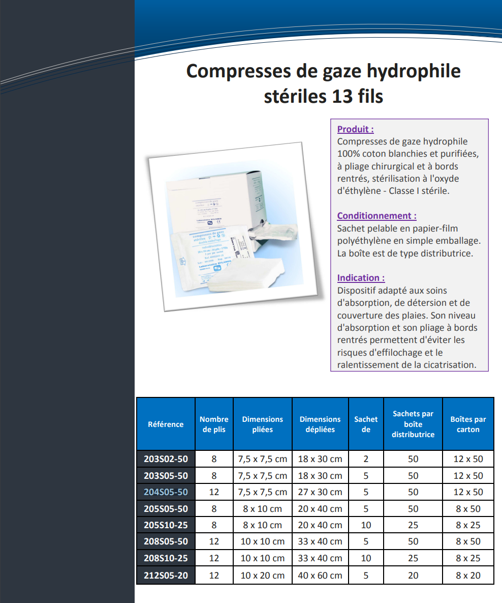 | Nom du produit | Compresses de gaze stériles, 12 plis, 13 fils 7,5x7,5 cm, boite de 50x 5 compresses, |